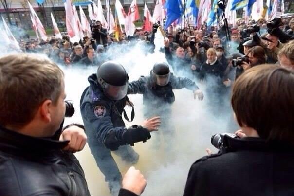 Невідомі у помаранчевих касках, які були у натовпі активістів, почали бити палками кордон охорони ВВшників. Також були помічені як кидают лідоруби.