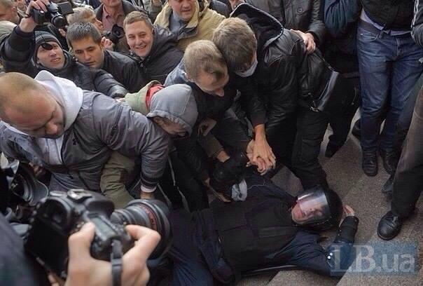 Инцидент произошел ранее вечером. "Беркутовца" выдернули из строя и оттащили в Дом профсоюзов. "Его удерживали в Доме профсоюзов Украины, однако правоохранители уже освободили коллегу", - сказано в сообщении.