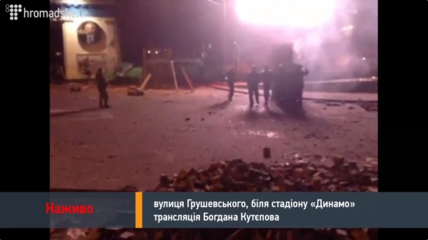 "Возле стадиона Динамо между автобусом и стадионом стоят двое "беркутовцев", прикрываясь щитами, в них регулярно летит брусчатка, бьют палками. Двух беркутовцев протестующие только что захватили у стадиона Лобановського. Хотели сначала побить, но потом отвели их к скорой, которая их и увезла," - написал журналист Дмитрий Гнап.