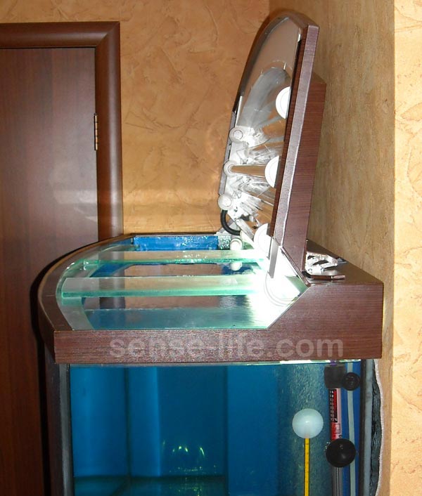 Крышка собрана и установлена. Как оказалось, она получилась жесткой и очень удобной при открытии и закрытии. Три лампы которые установлены в крышке на момент открытия можно отключать тумблерами, четвертая лампа которая вмонтирована в основание будет освещать при уборке аквариума.