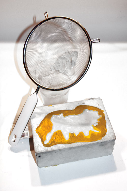 Освобождённый кот был обработан разделительной смазкой, установлен на основание опалубки и накрыт полученным гипсовым кожухом. Поскольку фотографии на данном этапе не отобразят всю глубину глубин, мы пользуясь навыками трехмерного моделирования виртуальной реальности, как бы заглядывая внутрь процесса, воссоздали картину изнутри. В роли оранжевой полосы на картинке в нашем случае выступал миллиметровый слой парафина, который герметизировал соединение кожуха и основания кота с основанием опалубки, чтобы залитый в форму полиуретан не вытек из формы. Как уже догадался уважаемый читатель, полиуретан обозначен желтым цветом.