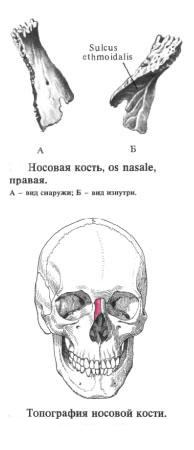 Носовая кость, os nasale парная, имеет форму четырехугольника, немного удлиненная и несколько выпуклая кпереди. Верхний край ее соединен с носовой частью лобной кости, латеральный край – с передним краем лобного отростка верхней челюсти.