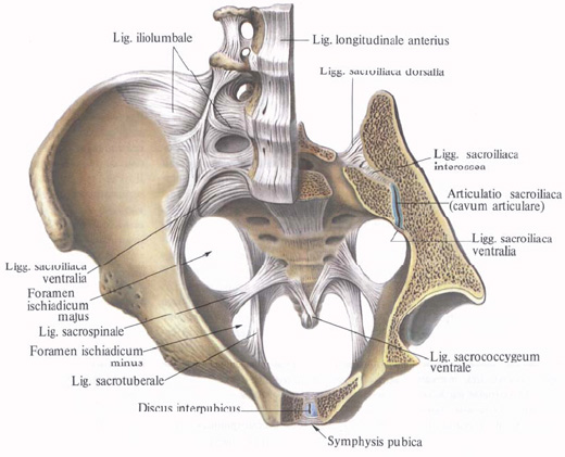 Тазовая кость, кроме крестцово-подвздошного сустава, соединяется с позвоночным столбом посредством ряда мощных связок, к которым относятся следующие: