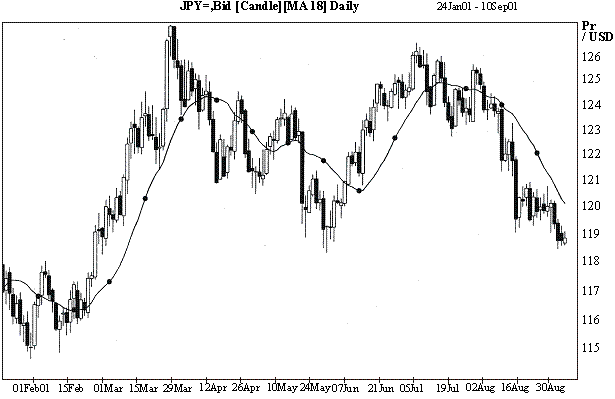 Рис. 15.14. Простий показник середнього руху курсу (МА, де n = 18)