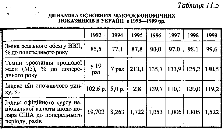 Протягом 1991-1993 pp. НБУ не мав можливості проводити незалежну ефективну монетарну політику. З дозволу Верховної Ради уряд за рахунок прямих емісійних кредитів НБУ практично повністю фінансував дефіцит державного бюджету. Крім того, за завданням уряду НБУ надавав кредити комерційним банкам для підтримки вітчизняних підприємств, більшість з яких були потенційними банкрутами. Кредити надавались за пільговою процентною ставкою, що була нижчою від офіційної ставки НБУ, а тим паче нижчою від рівня інфляції. Наслідком експансійної політики НБУ стали гіперінфляція та катастрофічний спад виробництва. Протягом 1993 р. грошова маса зросла у 19 разів, ціни більше як у 100 разів. Реальний обсяг ВВП скоротився у 1993 р. майже на 14%, а у 1994 р. ще більше - на 23% (табл. 11.5).
