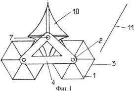 Причем размеры выбираются такими, чтобы расстояние от несущей оси 7 до крайней точки ротора 1 было больше, чем расстояние от оси 7 до крайней рассекающей части клина 10, при таких условиях конструкция всегда будет острием клина 10 направлена навстречу ветровому потоку. Установка рассекающе-направляющего клина 10 позволяет отвести ветровую энергию от нерабочей части ротора 1 и направить ее на рабочую часть, чем значительно увеличивается скорость ветрового потока и его плотность на рабочей части парусного ротора 1, что повышает эффективность работы ветроэнергетической установки.