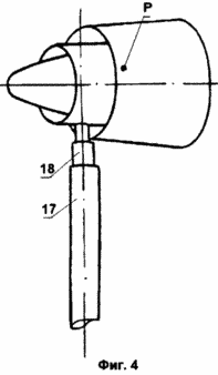 Опора энергоагрегата может быть выполнена в виде установленного на вершине колонны 17 шарнира 18, например, цилиндрического. Ось вращения шарнира расположена по ветровому потоку перед и в одной плоскости с центром ветрового давления Р энергоагрегата. Р является точкой приложения равнодействующей аэродинамических сил, воздействующих на энергоагрегат при обтекании его ветровым потоком. Такое выполнение обеспечивает разворот энергоагрегата на ветер при любом направлении последнего.
