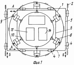 Поскольку сдвоенное шасси имеет две рамы: нижнюю 5 и верхнюю 6, перемещающиеся на направляющих 2 и 7 по пересекающимся направлениям, то нижняя рама 5 может делать возвратно-поступательные движения, назад-вперед, верхняя вправо-влево, следовательно, нижняя рама 5 реагирует на килевую качку (стрелки Б-Б), а верхняя рама 6 (стрелки А-А) - на бортовую.